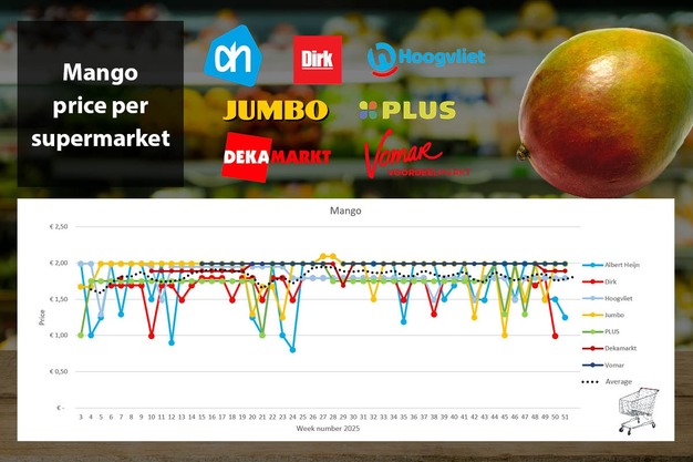 La promozione sui mango da Albert Heijn si intensifica: il prezzo viene ridotto di 25 centesimi a 1,25 euro, rendendolo anche in questo caso di gran lunga il fornitore più economico. La scorsa settimana Dirk aveva proposto i mango a 1 euro, ma nella settimana 51 sono assenti dallo scaffale online. Negli altri quattro supermercati analizzati non si registrano variazioni di prezzo.