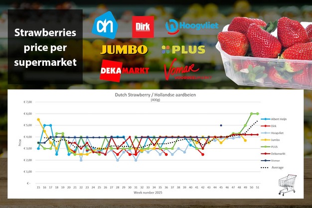 Da Jumbo le fragole sono nuovamente assenti dall'assortimento online, mentre da Dirk e Hoogvliet mancano già da diverse settimane. Tre dei sei supermercati monitorati continuano a mantenere le fragole nell'assortimento online; i prezzi restano invariati rispetto alla settimana 50.