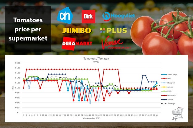 Il prezzo dei pomodori a grappolo da Albert Heijn e Plus continua a salire. Nella settimana 51 si registra un aumento di 14 centesimi per 500 grammi di prodotto sfuso da Albert Heijn (1,19 euro) e di 10 centesimi da Plus (1,09 euro). Hoogvliet, per la seconda settimana consecutiva, non offre pomodori a grappolo sfusi. In media, il prezzo settimanale aumenta di 5 centesimi, raggiungendo 1,09 euro.