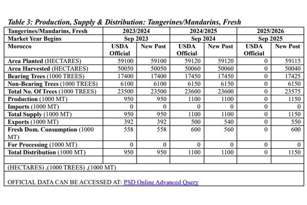 Si prevede che la produzione di mandarini del Marocco per la campagna 2025/26 raggiungerà circa 1,15 milioni di tonnellate, con un leggero aumento del 4% rispetto alla stagione precedente. La produzione di arance dovrebbe aumentare dell'1% rispetto all'anno precedente, raggiungendo 970.000 tonnellate, mentre la produzione di limoni/lime raggiungerà 48.000 tonnellate.