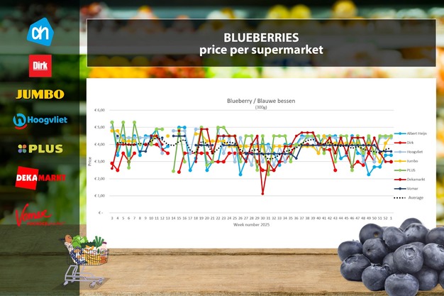 Le offerte sui mirtilli continuano anche nel 2026. Se il prezzo promozionale da Albert Heijn nell'ultima settimana del 2025 era sceso a 3,37 euro, questo valore è ancora mantenuto nella settimana 1 del 2026. L'offerta di Dirk rimane a 2,99 euro per una confezione da 300 grammi di mirtilli e DekaMarkt continua anch'essa con il prezzo promozionale di 2,99 euro. Nessuna promozione presso le altre catene di supermercati. Si osserva però che Jumbo spinge i prezzi verso l'alto fino a 4,49 euro.
