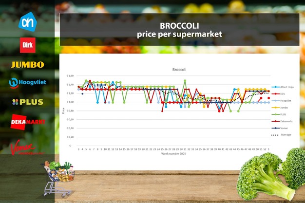 Poche variazioni nel reparto broccoli nella prima settimana del 2026. Sia da Hoogvliet, Plus, Dirk che DekaMarkt i prezzi restano invariati. Solo Albert Heijn e Jumbo scendono di 4 centesimi, arrivando entrambi a 1,25 euro.