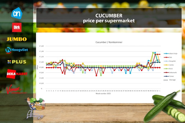 Gli aumenti di prezzo della fine del 2025 sembrano essere stati in parte annullati nel nuovo anno per i cetrioli. Sia Albert Heijn che Jumbo riportano il prezzo a 0,99 euro. Dirk, Hoogvliet, Plus e DekaMarkt rimangono invece invariati nella prima settimana del nuovo anno rispettivamente a 0,79, 0,99, 0,99 e 1,29 euro.