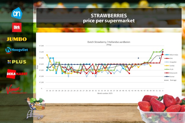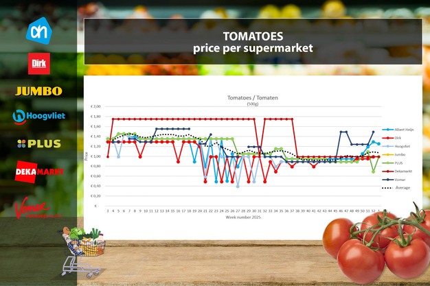 I dati sui prezzi provengono da Supermarktscanner.nl e si basano sui prezzi online nei negozi web di Albert Heijn, Jumbo, Plus, DekaMarkt, Dirk e Hoogvliet. Il prezzo riportato è una media che include anche le promozioni. In questa comparazione non si tiene conto di origine e qualità, poiché la maggior parte dei supermercati non fornisce queste informazioni sui propri siti. Solo Hoogvliet e Jumbo indicano il Paese d'origine. È quindi possibile che si confrontino, ad esempio, avocado acerbi con maturi, o cetrioli spagnoli con quelli olandesi.