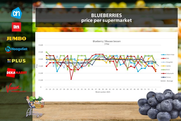 I supermercati continuano a stimolare i consumatori con promozioni sui mirtilli e, nella settimana 2, più che mai. In 4 dei 6 supermercati analizzati il prezzo si colloca tra 2,24 e 2,49 euro. Il prezzo medio di 300 grammi di mirtilli scende addirittura di 75 centesimi. È proprio questo l'extra sconto con cui DekaMarkt fa leva sulle promozioni (il prezzo in offerta nella settimana 1 era di 2,99 euro, mentre nella settimana 2 scende a 2,24 euro). In questo modo, DekaMarkt propone il prezzo più basso. Jumbo si colloca nella settimana 2 appena 1 centesimo sopra, con una riduzione sul prezzo fisso di 2,25 euro. Segue Dirk con 2,49 euro (-50 centesimi). Albert Heijn e Hoogvliet risultano nettamente più cari rispetto agli altri, con prezzi promozionali di 3,49 euro.