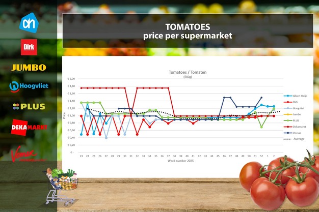 I dati sui prezzi provengono da Supermarktscanner.nl e si basano sui prezzi online nei negozi web di Albert Heijn, Jumbo, Plus, DekaMarkt, Dirk e Hoogvliet. Il prezzo riportato è una media che include anche le promozioni. In questa comparazione non si tiene conto di origine e qualità, poiché la maggior parte dei supermercati non fornisce queste informazioni sui propri siti. Solo Hoogvliet e Jumbo indicano il Paese d'origine. È quindi possibile che si confrontino, ad esempio, avocado acerbi con maturi, o cetrioli spagnoli con quelli olandesi.