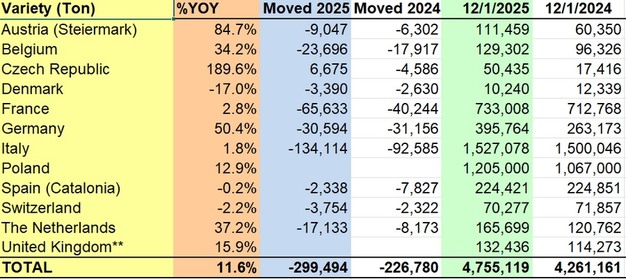 Le scorte totali di mele in Europa ammontavano a 4.755.119 tonnellate al 1° dicembre 2025, rispetto a 4.261.161 tonnellate di un anno prima, con un aumento dell'11,6% su base annua. La movimentazione delle mele dall'inizio della stagione ha raggiunto -299.494 tonnellate nel 2025, contro -226.780 tonnellate nel 2024.