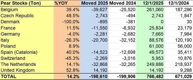 Il Belgio rimane il principale detentore di pere con 261.060 tonnellate, in aumento rispetto a 187.286 tonnellate, con una crescita del 39,4% su base annua. Seguono i Paesi Bassi con 249.886 tonnellate, rispetto a 218.937 tonnellate, pari a un aumento del 14,1% su base annua.