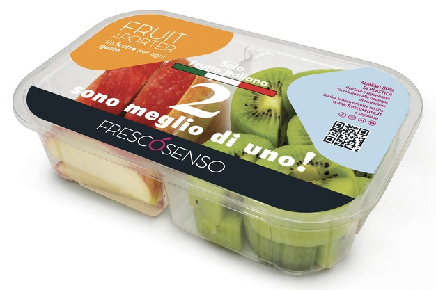Fra le proposte di Fresco Fresco, la linea "2 sono meglio di 1!", caratterizzata da un pack a doppio scomparto in modo da assaporare distintamente le varietà di frutta, nel pieno del gusto e delle proprietà organolettiche: