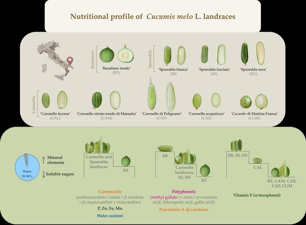 Somma A., Didonna A., Gattullo C.E., Durante M., Gonnella M., Di Spiridione C., Signore A., Palmitessa O.D., Terzano R., Santamaria P., 2026. Revealing the nutritional potential of nine vegetable melon (Cucumis melo L.) landraces of Puglia region (Southern Italy). "Journal of Food Composition and Analysis", 150, 108882.