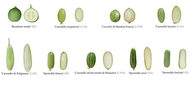 © Università di BariNello studio sono state considerate nove varietà locali di melone consumato allo stadio immaturo, tra le più note, commercializzate e apprezzate: Barattiere tondo, Carosello leccese, Carosello striato tondo di Massafra, Carosello di Polignano, Carosello scopatizzo, Cucumbr di Martina Franca, Meloncella (o Spuredda) bianca, Meloncella (o Spuredda) fasciata, Meloncella (o Spuredda) nera - generalmente considerate appartenenti ai macrogruppi "Barattiere", "Carosello" e "Meloncella o Spuredda".