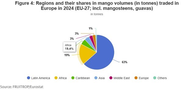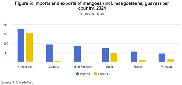 I mango vengono importati in Europa in volumi sempre maggiori, sostenuti da una fornitura annuale proveniente da diverse origini e dalla crescente domanda di frutta con una qualità gustativa costante. I consumatori europei mostrano una chiara preferenza per le varietà a basso contenuto di fibre, in particolare Kent e Keitt, e cresce l'interesse per i mango venduti maturi sull'albero, ready-to-eat o di IV gamma. I principali mercati di importazione europei per i mango freschi sono Paesi Bassi, Spagna, Germania, Francia e Belgio.