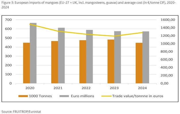 L'Europa è il secondo importatore mondiale di mango fresco. La domanda è stabile e continua a crescere, sostenuta dalle promozioni dei retailer e da una tendenza verso esperienze culinarie di qualità superiore. Il Brasile rifornisce il mercato europeo per tutto l'anno, con le Palmer, Keitt, Tommy Atkins e Kent come principali varietà di esportazione. La Osteen rappresenta solo una piccola quota delle esportazioni brasiliane. Il Perù esporta esclusivamente il mango Kent ed è rinomato per la qualità costante, sebbene la produzione sia diminuita nelle ultime stagioni a causa del fenomeno di El Niño.