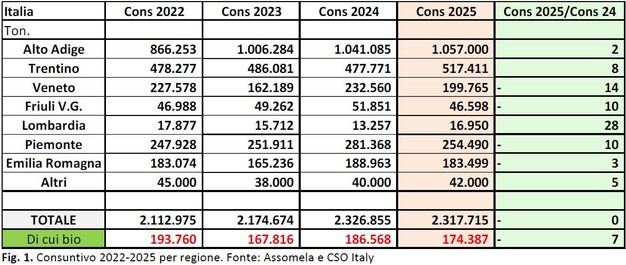 La produzione italiana di mele raggiunge le 2.317.715 tonnellate, confermandosi perfettamente in linea con il consuntivo 2024 e risultando superiore di circa 200 tonnellate rispetto a quanto comunicato nel mese di dicembre.