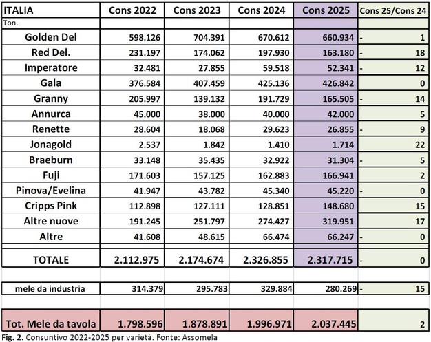A livello varietale, la produzione di Golden Delicious registra un lieve calo dell'1% rispetto all'anno precedente, attestandosi a 660.934 tonnellate. In decisa diminuzione la Red Delicious (-18%), che segna il livello produttivo più basso degli ultimi quattro anni con 163.180 tonnellate.