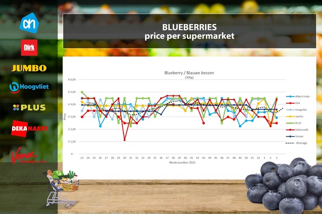 Il prezzo medio settimanale dei mirtilli (300 grammi) aumenta notevolmente nella settimana 3. Ciò è dovuto soprattutto al fatto che DekaMarkt torna al prezzo fisso di 4,39 euro (+2,15 rispetto alla settimana 2). Anche PLUS (+1,00 euro) e Hoogvliet (+0,90 euro) tornano al prezzo fisso. Jumbo aumenta il prezzo di 1,25 euro, ma i mirtilli restano in promozione (da 4,49 a 3,49 euro). Dirk e Albert Heijn continuano con forti ribassi. Da Dirk i mirtilli da 300 grammi costano 2,49 euro fin dalla settimana 1. Albert Heijn intensifica ulteriormente le promozioni della settimana 2, passando da 3,49 euro a 2,92 euro.