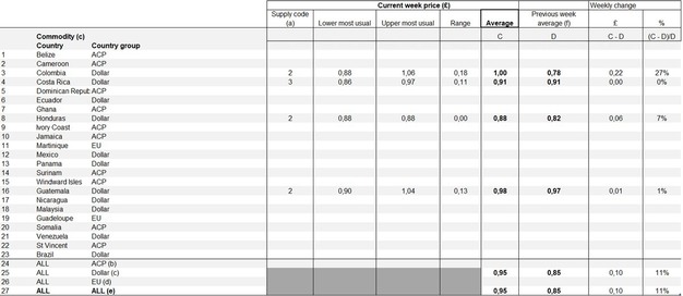 Nel complesso, le banane provenienti da tutti i paesi ACP hanno registrato un prezzo medio di 0,95 sterline (1,09 euro) al chilogrammo, in aumento rispetto alle 0,85 sterline (0,98 euro) della settimana precedente. L'aumento di 0,10 sterline (0,11 euro) rappresenta un incremento settimanale dell'11%. Gli stessi dati sono stati registrati per tutte le origini combinate, con una media complessiva pari a 0,95 sterline (1,09 euro) al chilogrammo, rispetto alle 0,85 sterline (0,98 euro) della settimana precedente, con un aumento di 0,10 sterline o dell'11%.