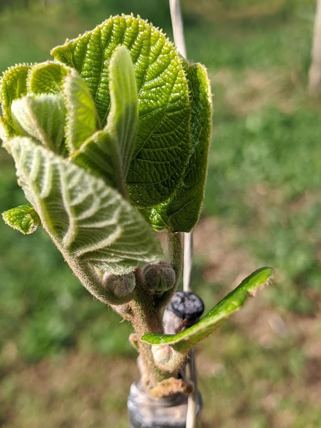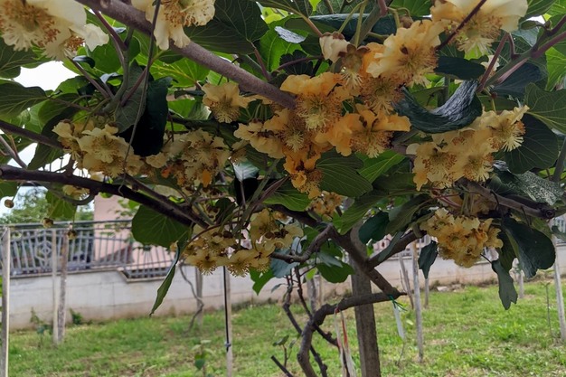 Foto a sinistra: pianta madre di kiwi Supplì trasferita nel 2023 a Sermoneta. Foto a destra: dettaglio di ramo con boccioli fiorali. |