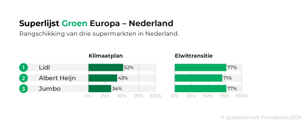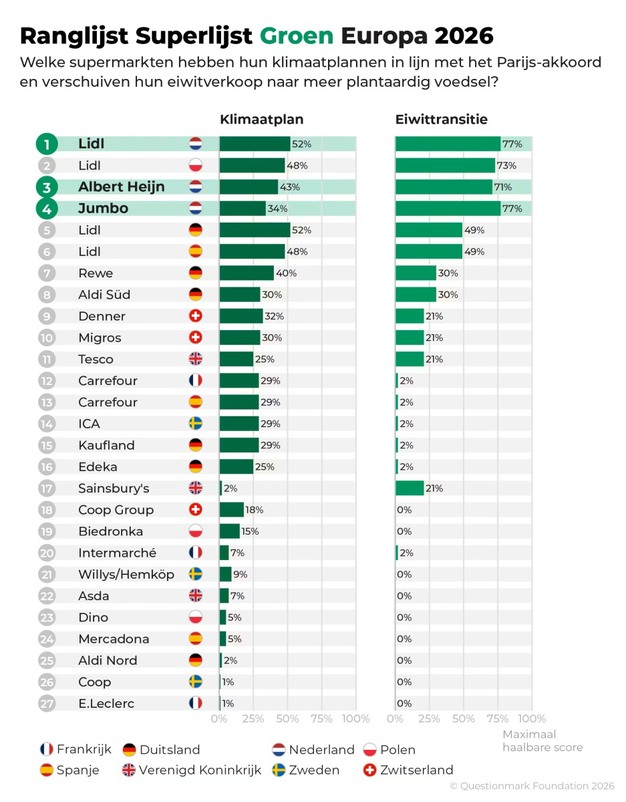 I supermercati olandesi Albert Heijn, Lidl e Jumbo figurano tra i migliori in Europa per quanto riguarda i piani verso un sistema alimentare più sostenibile. È quanto emerge dalla Superlista Verde Europa 2026 del think tank Questionmark. In particolare Lidl e Albert Heijn ottengono punteggi elevati nella traduzione degli obiettivi climatici in piani concreti. Allo stesso tempo, però, le emissioni totali di CO₂ continuano ad aumentare per entrambi i rivenditori, mentre solo Jumbo mostra una lieve diminuzione. Di conseguenza, gli obiettivi dell'Accordo di Parigi sul clima non sono ancora raggiungibili.