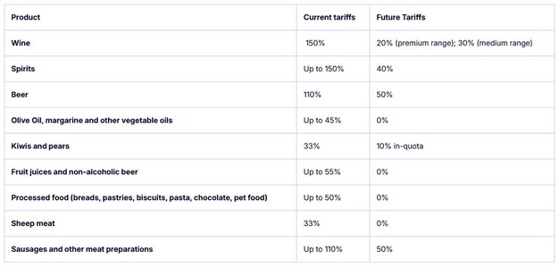 L'accordo di libero scambio elimina le tariffe indiane, spesso proibitive, nel pieno rispetto dei settori agricoli sensibili di entrambe le parti, e garantisce un accesso al mercato agricolo senza pari rispetto ad altri accordi commerciali dell'India, come quelli con il Regno Unito e l'Australia.