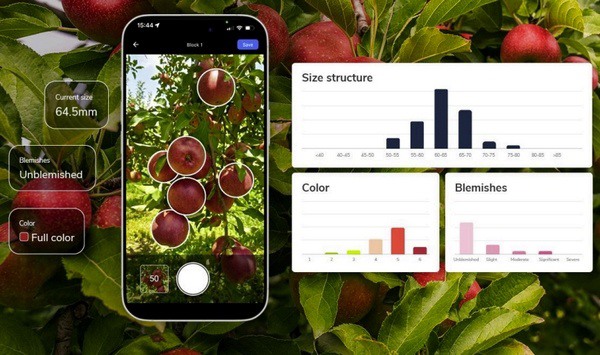 Nella produzione di mele, lo strumento consente di misurare le dimensioni, il colore e le imperfezioni dei frutti sia prima sia dopo la raccolta. L'identificazione precoce dei difetti e il monitoraggio costante della crescita dei frutti e dello sviluppo del colore possono aiutare a standardizzare la classificazione tra i team. I dati raccolti sul campo vengono consolidati in dashboard centralizzate, destinate a supportare le previsioni, la pianificazione della raccolta e l'allineamento tra i team di produzione e commerciali.