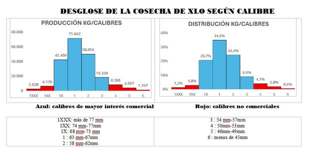 La XLO può contribuire ad aumentare la redditività, grazie ai calibri che produce. I dati di misurazione e raccolta mostrano che la coltura include principalmente calibri 1X, 1, 2 e 3 (54-73 mm), che costituiscono l'89% del raccolto e sono i calibri di maggior valore commerciale. I calibri molto grandi sono rari, mentre quelli molto piccoli sono minimi.