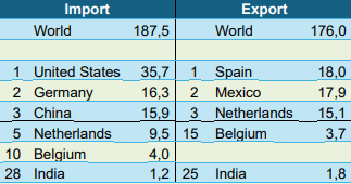 Con quasi 1,5 miliardi di abitanti, l'India è il Paese più popoloso del mondo e svolge anche un ruolo importante nella produzione globale di frutta e verdura. A livello mondiale, si colloca al secondo posto, molto più in alto della Cina. Tuttavia, per quanto riguarda il commercio di frutta e verdura fresca, la sua posizione rimane limitata, attestandosi tra il 25° e il 30° posto a livello globale.