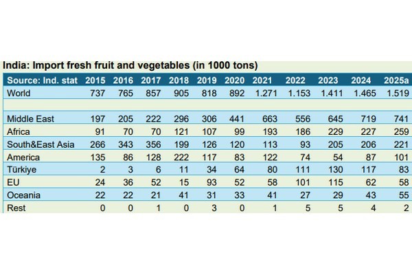L'India è un esportatore netto di frutta e verdura fresca. Tuttavia, nell'ultimo decennio, le importazioni sono aumentate significativamente, raggiungendo circa 1,5 milioni di tonnellate lo scorso anno, circa il doppio rispetto a dieci anni fa. Le esportazioni sono più volatili: lo scorso anno hanno raggiunto 3,8 milioni di tonnellate, un valore superiore a quello del 2024, ma inferiore ai 4,1 milioni del 2023.