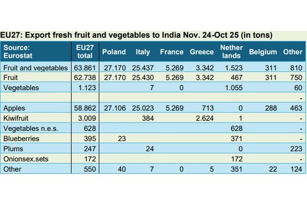 Le importazioni dai Paesi dell'Ue sono limitate a circa 60.000 tonnellate all'anno. Polonia e Italia sono i principali fornitori, in particolare di mele. Si registra anche un notevole afflusso di kiwi dalla Grecia. Le esportazioni dai Paesi Bassi e dal Belgio sono molto limitate. Secondo Eurostat, i Paesi Bassi hanno esportato in India circa 1.500 tonnellate lo scorso anno e il Belgio oltre 300 tonnellate, principalmente mele. La crescita è visibile in alcuni gruppi di prodotti più limitati, tra cui kiwi, mandarini, pere e uva da tavola.