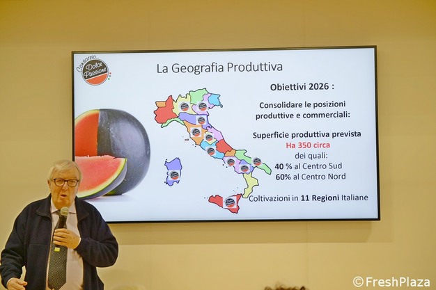 "Gli obiettivi del 2026 - afferma il direttore del Consorzio, Luciano Trentini - sono il consolidamento della produzione, grazie agli oltre 350 ettari in coltivazione, distribuiti su 11 regioni italiane in modo da avere il calendario più esteso possibile. Puntiamo tutto sulla produzione italianità, senza ricorrere a forniture dall'estero, da maggio ad ottobre, che è la giusta finestra temporale per l'anguria. Investiamo inoltre ancora sui mercati esteri, dato che nel 2025 abbiamo superato il 50% della produzione commercializzata oltre confine (circa 10mila tonnellate) toccando 16 paesi".