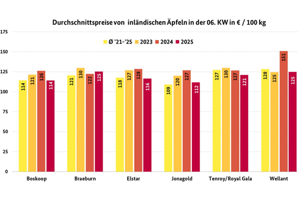 Nella settimana 6 del 2026, il mercato tedesco è stato dominato dai carichi nazionali. Le mele Jonagold, Elstar, Boskoop e Braeburn hanno continuato a essere le principali varietà disponibili. L'Italia ha fornito principalmente Pink Lady, Golden Delicious e Granny Smith. La Francia ha fornito principalmente Pink Lady e Jazz. Spedizioni più piccole dai Paesi Bassi hanno completato la gamma.