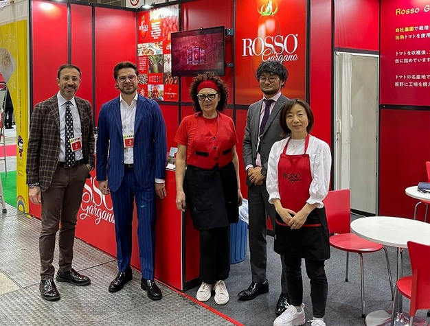 © ROSSOGARGANO S.C.A.P.A.Da sinistra a destra: Giuseppe Stasi, Andrea Demaio e sua madre, insieme ad alcuni colleghi giapponesi durante la fiera Foodex Japan