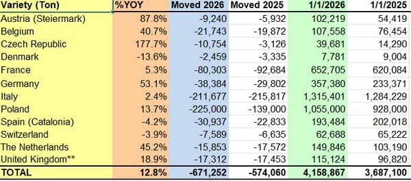 La maggiore consistenza delle giacenze suggerisce una disponibilità continua sul mercato europeo nella seconda metà della stagione, con Italia e Polonia che continuano a influenzare le dinamiche dell'offerta.