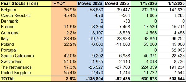 Le scorte europee di pere ammontavano a 630.678 tonnellate al 1° gennaio 2026, con un aumento del 3,6% rispetto alle 608.544 tonnellate dell'anno precedente. La crescita si è concentrata in diversi Paesi dell'Europa settentrionale, mentre i produttori meridionali hanno mostrato risultati contrastanti.