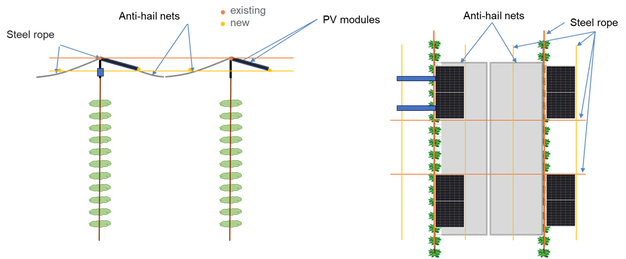 Nella Figura 2 è riportato lo schema di integrazione tra moduli fotovoltaici e struttura di un frutteto, che sfrutta prevalentemente l'ossatura di sostegno esistente, integrandola con tenditori in acciaio e semplici elementi di supporto per il sostegno dei moduli. La soluzione proposta è estremamente leggera ed elastica, in grado di adattarsi alla naturale variazione della geometria dell'impalcato nel tempo e di resistere al carico degli agenti atmosferici. Questo approccio consente di gestire diversi posizionamenti rispetto al filare e diversi orientamenti dei pannelli fotovoltaici per adattare l'installazione al sito e alla produzione agricola sottostante.