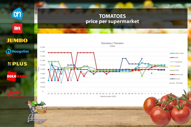 I dati sui prezzi provengono da Supermarktscanner.nl e si basano sui prezzi online nei negozi web di Albert Heijn, Jumbo, Plus, DekaMarkt, Dirk e Hoogvliet. Il prezzo riportato è una media che include anche le promozioni. In questa comparazione non si tiene conto di origine e qualità, poiché la maggior parte dei supermercati non fornisce queste informazioni sui propri siti. Jumbo vende solo pomodori a grappolo confezionati da 5 pezzi invece che a peso (500 g o 1 kg).
