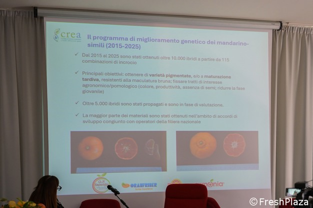 A seguire, l'intervento di Riccardo Russo, ricercatore CREA, che ha relazionato sul tema "Dalla tradizione al futuro: l'evoluzione varietale degli agrumi". Durante il suo intervento, Riccardo Russo ha illustrato l'impegno del CREA nell'evoluzione varietale, sottolineando come l'attività di ricerca spazi dalla selezione di portainnesti al miglioramento genetico di specie chiave.