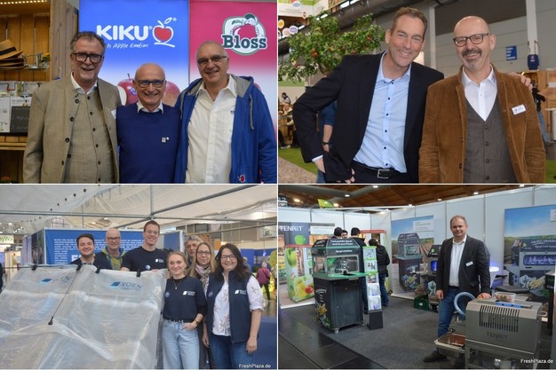 Espositori alla Fruchtwelt Bodensee di quest'anno. In senso orario: Jürgen Braun di Adema con i partner di SalemFrucht e Seefrucht GmbH, l'amministratore delegato di OvB Tim Strübing con Erich Röhrenbach, presidente di Obstregion Bodensee e. V., il nuovo espositore Sascha Wietbrauk di Tenrit GmbH e il team di VOEN Vöhringer.