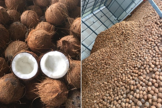 Noci di cocco fresche per l'esportazione in Europa. La coltivazione a contratto è certificata Rainforest.