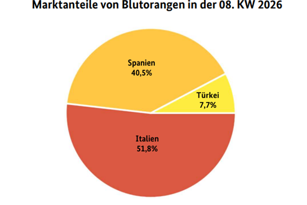 Le consegne spagnole sotto forma di Navelate, Salustiana e Lane Late hanno dato il tono al mercato tedesco nella settimana 8 del 2026. La loro disponibilità è stata piuttosto limitata. Anche le importazioni dalla Turchia, sotto forma di Washington Navel, hanno perso un po' di slancio. Gli arrivi di Valencia Late dall'Egitto sono aumentati, mentre le arance Baladi sono state solo un fenomeno marginale, secondo il rapporto BLE. Le spedizioni italiane hanno completato l'offerta di arance.