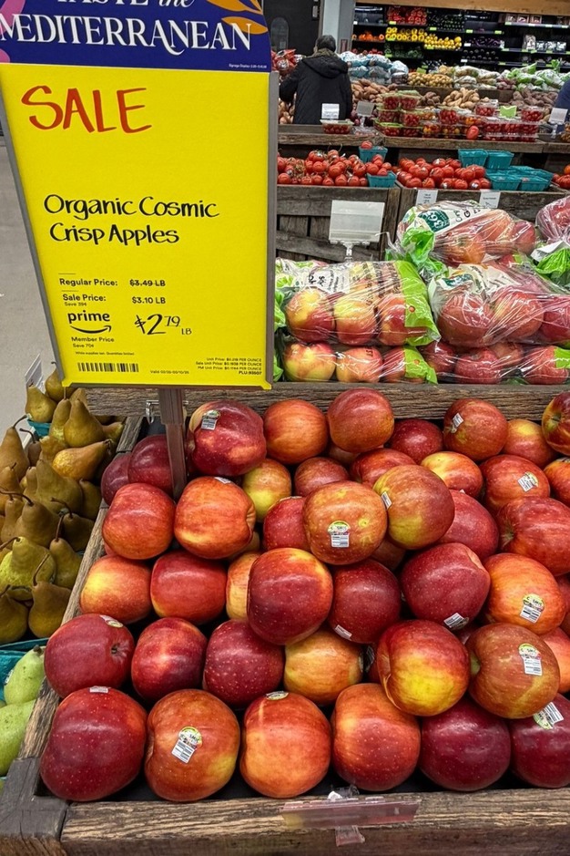 Un capitolo a parte è il discorso prezzi su cui Whole Foods si distingue senza remore, posizionandosi in fascia alta, altissima. A titolo di esempio, ho memorizzato: un finocchio singolo 3.49 dollari, un mazzo di bietina 2.99 dollari, mele Cosmic Crisp bio 3.49 dollari la libbra (453 grammi) o 2.79 se cliente Prime. Da non replicare!