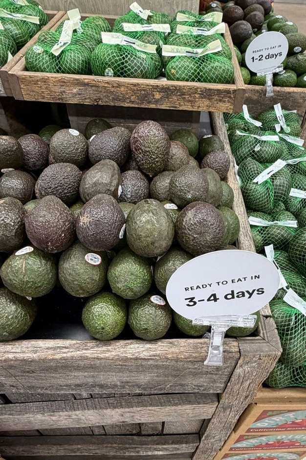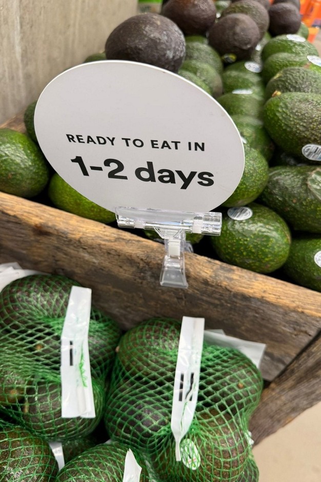 Molto interessante la comunicazione sul mondo avocado, di cui gli USA sono tra maggiori consumatori mondiali. Un cartello a latere della cassa indica l'indice di maturazione dei frutti riportando la dicitura: "ready in 1-2 days" o "ready in 3-4 days". Da replicare!