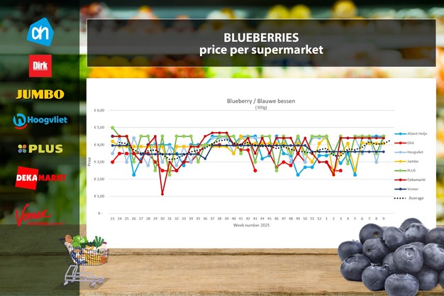 Nella settimana 9 nessuno dei supermercati monitorati promuove i mirtilli e ciò provoca un forte aumento del prezzo medio settimanale, che raggiunge 4,27 euro per 300 grammi. Albert Heijn, Dirk e PLUS hanno il prezzo più alto (4,49 euro). Vomar si distingue: non fa promozioni, ma mantiene un prezzo stabile e basso di 3,59 euro.