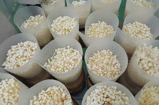 "Utilizziamo un sistema di coltivazione controllato, che comprende la preparazione del substrato, la sterilizzazione, l'inoculazione, l'incubazione, la fruttificazione e la raccolta. I volumi destinati all'esportazione sono soggetti a ulteriori standard di controllo per classificazione e confezionamento. Il processo si articola in cinque punti chiave. Innanzitutto, la preparazione del substrato (a base di segatura e nutrienti) e il riempimento dei contenitori, seguiti da sterilizzazione e raffreddamento per ridurre la contaminazione e raggiungere la temperatura di inoculazione. Si procede quindi all'inoculazione con micelio e all'incubazione (crescita miceliare), seguita dall'induzione della fruttificazione mediante controllo di temperatura, umidità e CO2 (il controllo ambientale influisce fortemente sulla qualità dell'Enoki). Infine, è il momento della raccolta, della classificazione e del confezionamento, dopodiché inizia la distribuzione lungo la catena del freddo", spiega Jeong.