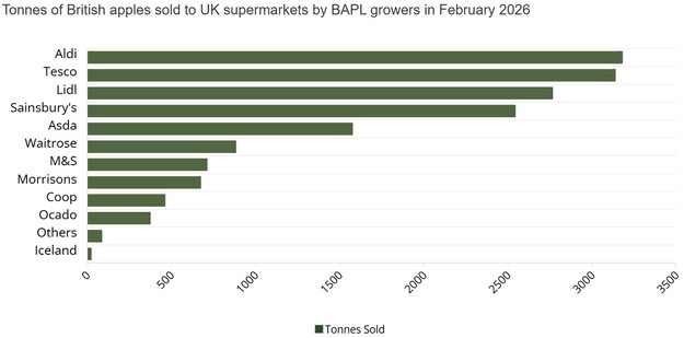 In termini di volume totale, Aldi ha acquistato la maggior quantità di mele inglesi dai coltivatori della British Apples & Pears Limited (BAPL) durante il mese, con poco più di 3.100 tonnellate. Tesco ha seguito da vicino con poco più di 3.000 tonnellate. Lidl si è classificato terzo con circa 2.750 tonnellate, mentre Sainsbury's ha acquistato circa 2.550 tonnellate. Asda ha registrato acquisti per circa 1.550 tonnellate di mele inglesi, posizionandosi a metà classifica tra i principali rivenditori.