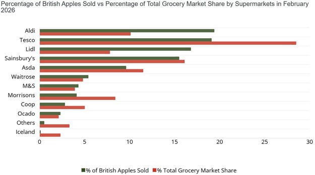 Quando i dati vengono esaminati come quota delle mele inglesi totali vendute rispetto alla quota di ciascun rivenditore sul mercato alimentare del Regno Unito, emerge un quadro diverso.