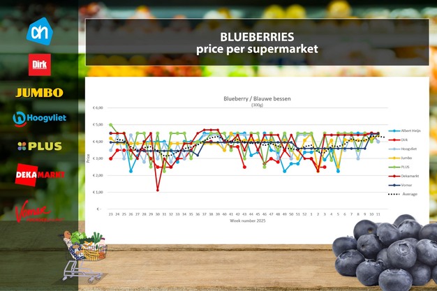 Il prezzo medio settimanale dei mirtilli scende nella settimana 11 a 4,25 euro per 300 grammi, con un calo di 11 centesimi rispetto alla settimana 10. La diminuzione è dovuta a sconti simultanei in diversi supermercati. Albert Heijn, Dirk e Hoogvliet propongono offerte con mirtilli (300 g) a 3,99 euro. Jumbo invece aumenta il prezzo di 18 centesimi a 4,37 euro e Plus addirittura di 50 centesimi a 4,49 euro. DekaMarkt e Vomar mantengono i prezzi rispettivamente a 4,49 e 4,45 euro.
