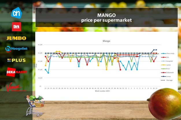 Il prezzo medio del mango aumenta nella settimana 11 di 4 centesimi, raggiungendo 1,96 euro per pezzo. Questo aumento è interamente attribuibile a Dirk, dove è terminata una promozione: il prezzo passa da 1,49 a 1,79 euro. Tutti gli altri supermercati mantengono i prezzi della settimana 10: Albert Heijn 1,99 euro, Hoogvliet 1,79 euro, Jumbo 1,99 euro, Plus 1,99 euro, DekaMarkt 1,99 euro e Vomar 2,19 euro.