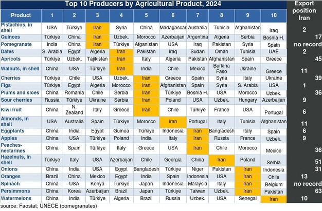 L'Iran figura 20 volte tra i primi 10 produttori mondiali di ortofrutta (in volume), tra cui pistacchi, melograni, datteri, albicocche, noci, ciliegie, fichi, mele, pesche, agrumi, cipolle e angurie, secondo i dati FAOSTAT 2024. Per molti di questi prodotti rientra anche tra i primi 15 esportatori globali.