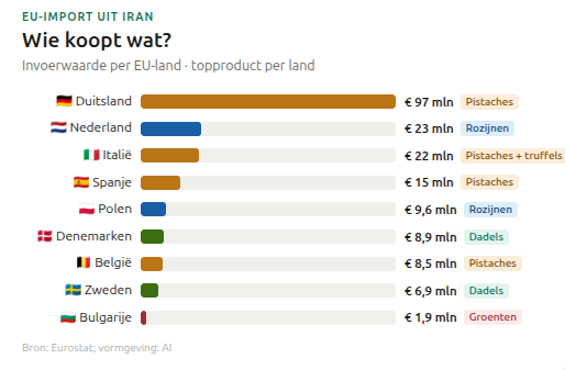La Germania è di gran lunga il principale importatore, con un valore totale di quasi 97 milioni di euro dall'Iran - oltre quattro volte il secondo Paese in classifica. I Paesi Bassi si posizionano al secondo posto con oltre 23 milioni di euro, seguiti da Italia (22 milioni) e Spagna (15 milioni).